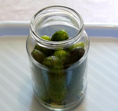Аккуратно помещаем в банку огурцы, потом зонтик укропа.