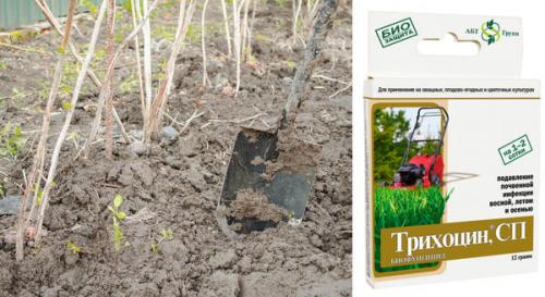 После обработки почву следует прорыхлить, чтобы основа препарата — почвенный полезный гриб Trichoderma — попал в грунт и начал работать против болезнетворных патогенов.