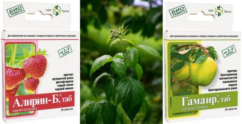 В фазу бутонизации проводим опрыскивание кустов малины баковой смесью препаратов «Алирин-Б» и «Гамаир» «Алирин-Б» и «Гамаир» — биопрепараты, созданные на основе полезной природной бактерии Bacillus subtilis , но разных штаммов. Применение их в комплексе защищает малину и другие садовые растения от большинства болезней грибной и бактериальной природы.