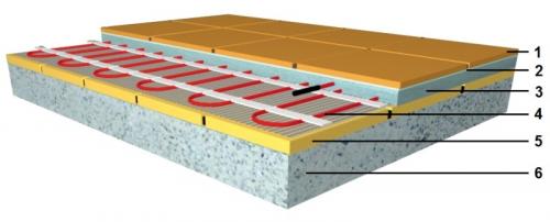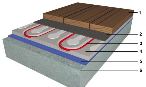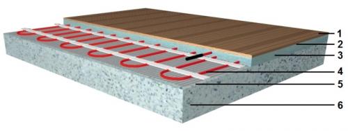 ![]() | Электрический теплый пол под деревянное напольное покрытие, ламинат, ковролин. 1 — Деревянный пол, ламинат или ковролин; 2 — Подложка под ламинат; 3 — Самовыравнивающаяся смесь для пола; 4 — Нагревательный кабель или нагревательный мат; 5 — Грунтовочный слой или стяжка; 6 — Бетонное основание пола. |