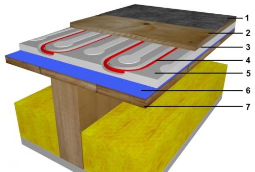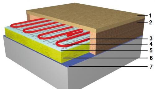 ![]() | Электрический теплый пол в деревянных полах на лагах. 1 — Деревянное напольное покрытие; 2 — Лаги деревянного пола; 3 — Нагревательный кабель или нагревательный мат; 4 — Тонкая монтажная сетка; 5 — Изоляция; 6 — Пароизоляция; 7 — Бетонное или деревянное основание. |
