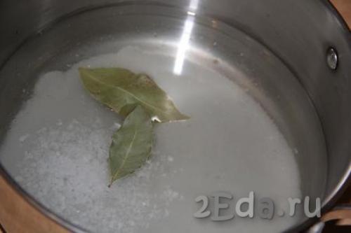 Для приготовления маринада влить воду в кастрюлю, добавить масло, сахар, уксус, лавровые листья и соль.