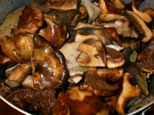 Если вы планируете замариновать свинушки, то первые два раза проварите грибочки в чистой водичке. А в третий раз уже можно готовить их в маринаде в течение 40 минут. Маринад готовится совсем просто. Добавьте в установленных пропорциях соль, сахарный песок, листики лавра, душистый перчик горошком и соцветия гвоздики. А вот уксусную кислоту добавляют в маринад в самом конце.